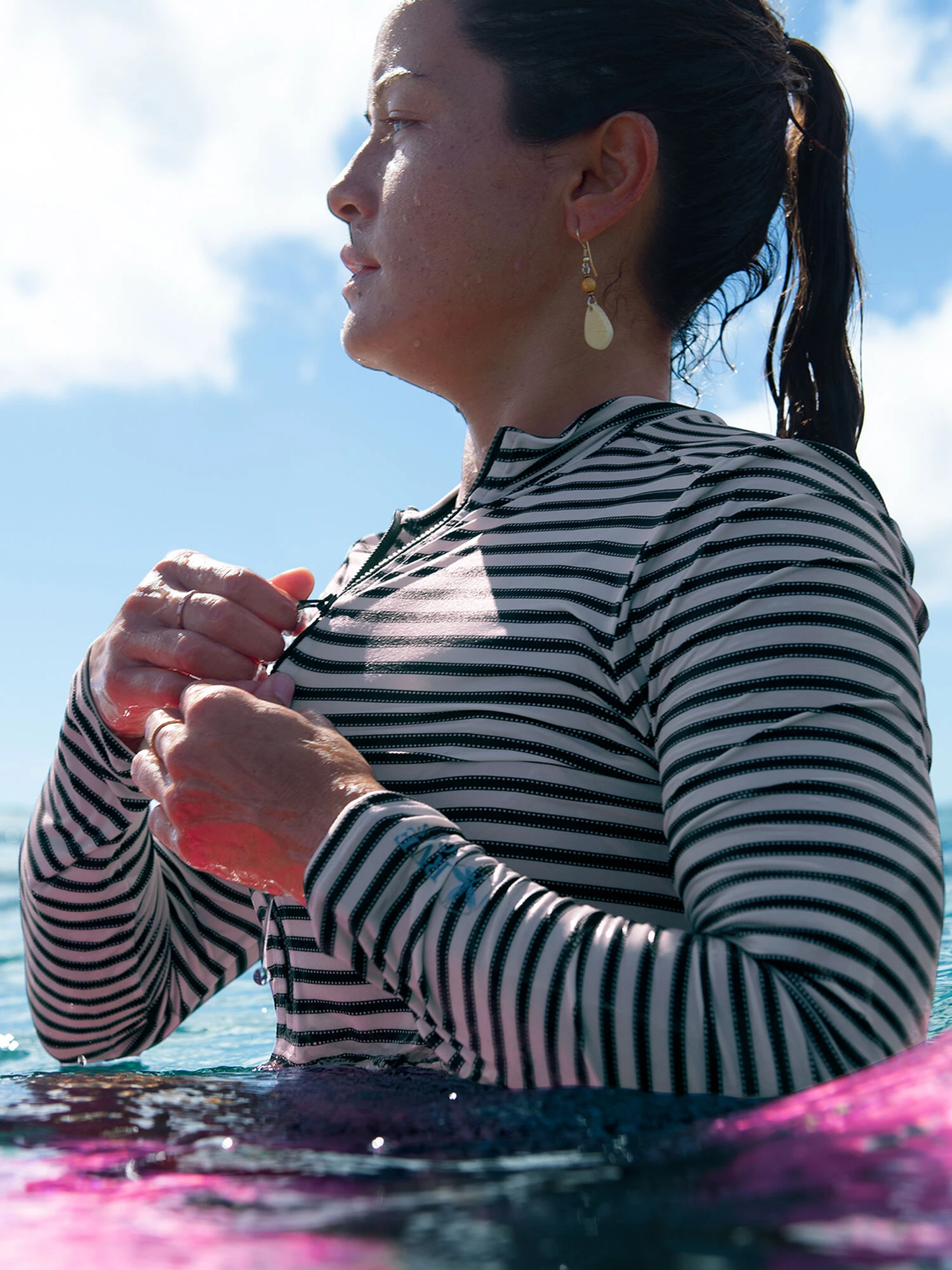 Paddle-ready protection that stands up to the sun, keeping us comfortably covered in every venture. Adjustable, side ruching allows for custom length. Half-zip. By Carve Designs. S(4-6), M(8-10), L(12), XL(14).