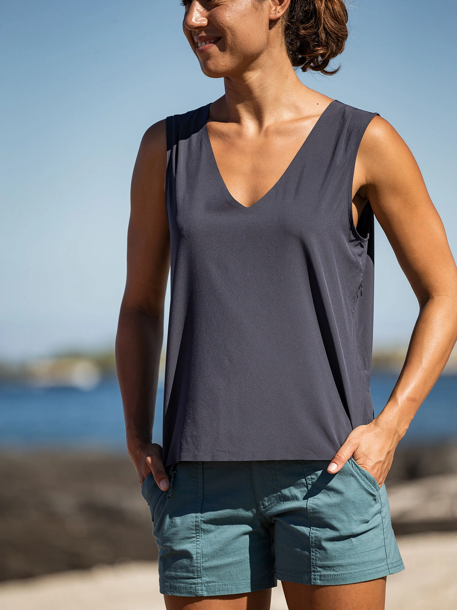 PACKED WITH POSSIBILITIES: Spin it right ’round: scoop or v-neck, there’s no wrong way to take a Round Trip. Go ahead, name the destination and the number of days. No matter the itinerary, it only takes one Round Trip. Made of Nimbleneā¢, the wrinkle-shirking, run-ready woven that drapes just right, and delivers UPF 50 to boot. By Title Nine. XS(2), S(4-6), M(8-10), L(12-14), XL(16).